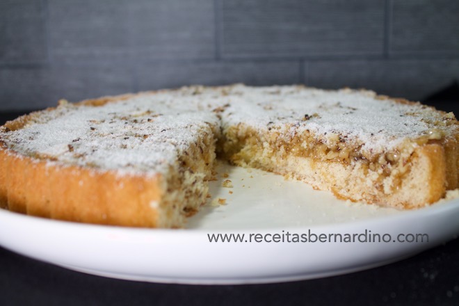 Assim que o recheio ficar louro, retire a tarte do forno e quando arrefecer, polvilhe com açúcar em pó se deseja, pois é opcional.