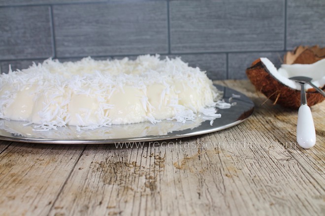 Passado o tempo necessário desenforme o pudim e enfeite com o coco ralado.