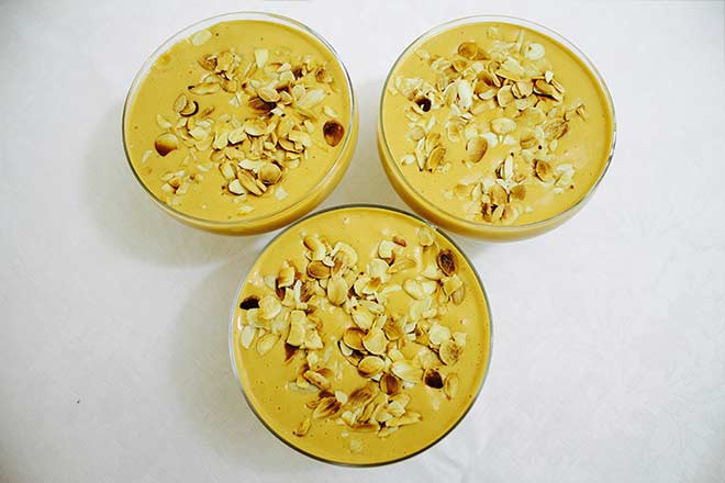 Em seguida distribua a mistura em taças, e caso tenha algum fruto seco, decore por cima do doce, lembrando que é opcional, pois se não tiver, não tem problema.