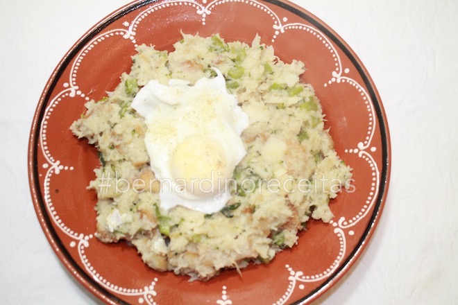 Mexa durante um minuto com lume brando e acrescente em seguida duas conchas da água que cozeu o bacalhau.