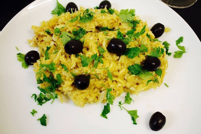 Os ingredientes principais deste comer são o bacalhau desfiado, batata palha, cebola, ovos batidos, azeitonas, salsa, pimenta e uma porção generosa de azeite.