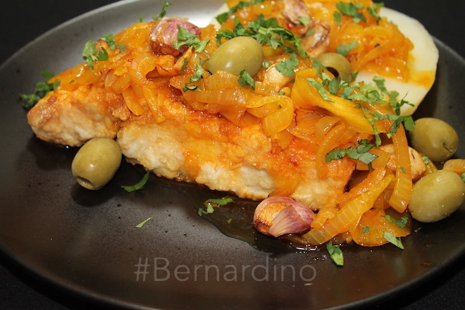 Disponha no prato primeiramente a posta de bacalhau, o acompanhamento que foi preparado, por cima da posta e do acompanhamento a cebolada e o molho, os dentes de alho torrados, os coentros e para finalizar as azeitonas.