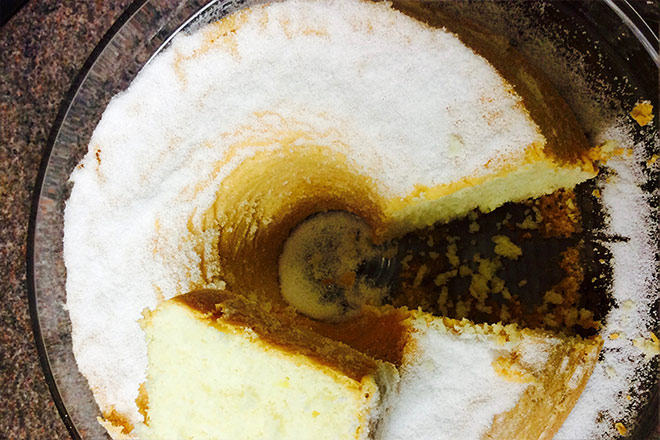 Quando o bolo estiver frio, desiforme e povilhe por cima o açúcar em pó. Lembrando, só povilhe o bolo com açúcar em pó quando o mesmo estiver frio, caso contrario, o açúcar derrete todo se o bolo estiver quente.