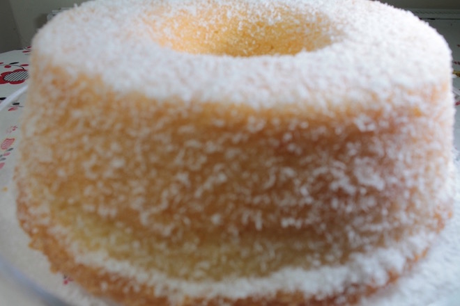 O bolo de limão com cobertura de coco ralado está pronto para ser servido.