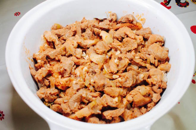 No fim de ficar loura, ponha então a carne temperada anteriomente. Deixa estar a carne com o lume brando pelo tempo de 20 minutos, entretanto vá mexendo sempre.