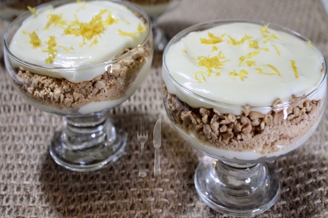 Monte o doce nas taças da seguinte forma: a primeira camada de bolacha triturada, a seguir o creme de limão, a terceira camada de bolacha triturada e por último o creme de limão.