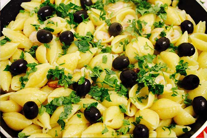 Assim que o azeite estiver bem envolvido na massa, desligue o fogão e decore com a salsa picada e com as azeitonas pretas.