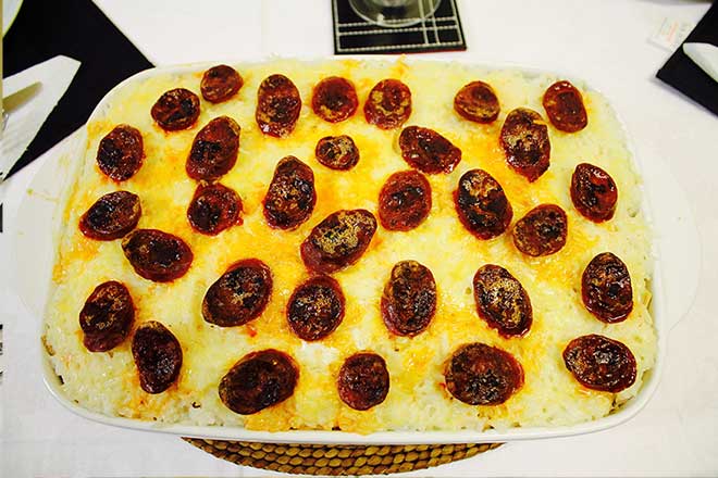 Após pincelar as gemas por cima do arroz, decorre com as rodelas de chouriço e leve ao forno a 250ºC por 15 minutos.