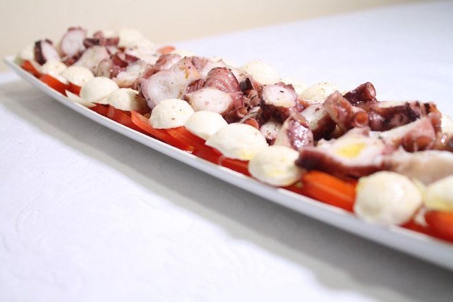 Acrescente o polvo cortado por cima, e regue novamente a salada com um fio de azeite.