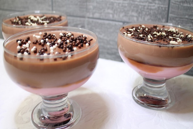 Adicione um pouco mais de caramelo líquido por cima do pudim de morango, se desejar, e de seguida adicione o pudim de chocolate por cima, até encher a taça.