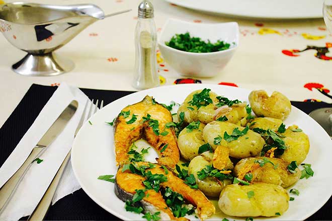 Após assado, sirva o Salmão nos pratos juntamente com as batatas, antes retire o sal das batatas.