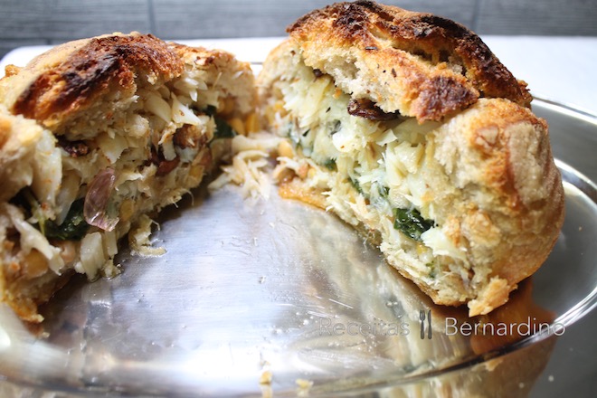 De seguida acrescente o grão, as folhas de couve, e o bacalhau desfiado até ficar todo preenchido o pão caseiro por dentro, e reserve.