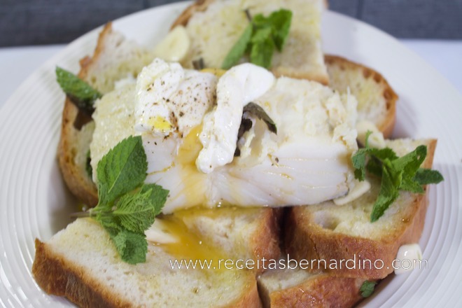 Na água que cozeu o bacalhau escalfe o ovo, deixa-se a ferve por 3 minutos.