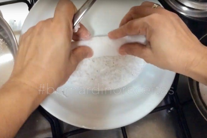 De posse do polvilho doce (seco), foi necessário hidratá-lo, posto que só hidratando o polvilho é que conseguimos preparar a tapioca. Este processo eu ensino no vídeo da receita Tapioca com ovo mexido, pois penso que é importante passar essa informação para as pessoas que desejam preparar a tapioca e não sabem por onde começar, principalmente quem mora fora do Brasil ou é estrangeiro igual a mim, que um dia degustou essa delícia e tem vontade de preparar em casa, é claro que na época preparei recebendo algumas dicas da minha esposa que é brasileira. Para quem quer aprender é fácil, basta ter força de vontade.