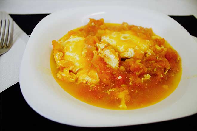 No fim de 20 minutos, abranda-se o lume, retira-se a colher e adiciona os 3 ovos, neste momento, não se deve mais mexer os tomates, por isso o lume tem que ficar brando, por mais ou menos 15 minutos.